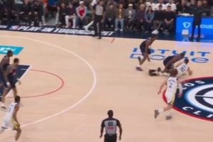 GIF-库里被包夹倒地 快船断球